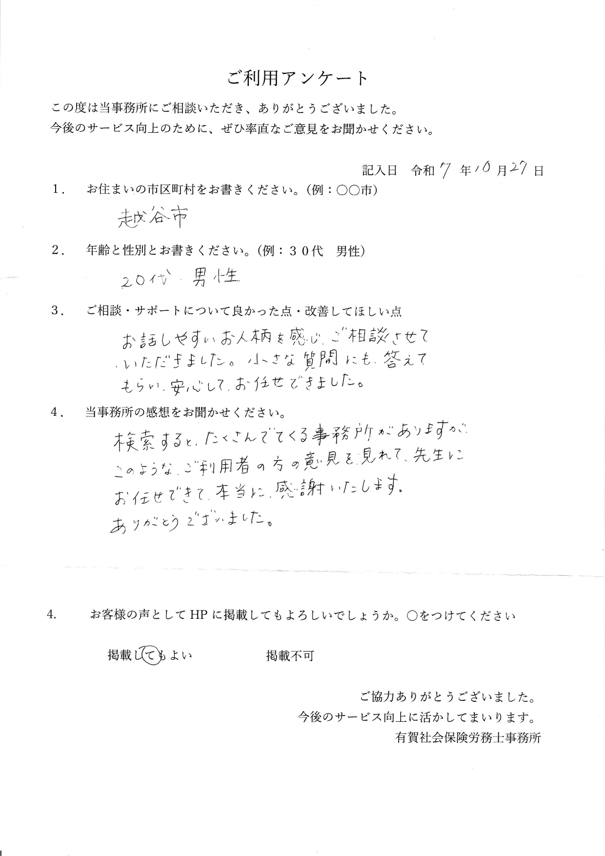ご家族様からの相談で、息子さんの20歳前障害の手続きを行いました。病歴・就労状況等申立書の作成にあたり日常生活や就労状況についてのヒアリングに何度もご協力いただきました。障害者雇用で就業中でいらっしゃいましたが、様々な情報が氾濫していてご家族としては障害年金を受給できるかどうか心配されていました。無事障害基礎年金2級が決定しました。ご依頼いただき誠にありがとうございました。