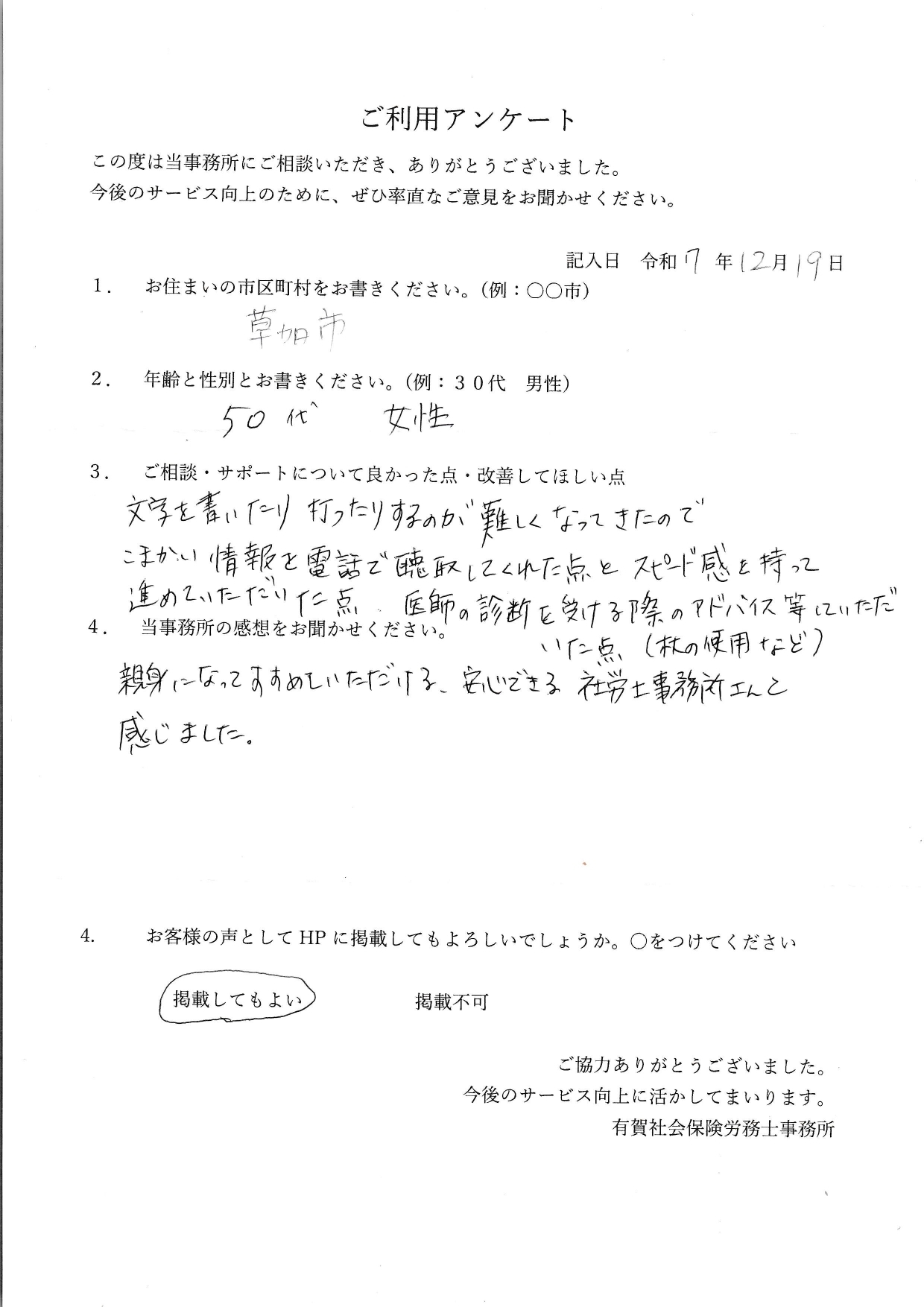症状がすすみ通勤の難しさや仕事上の不自由さがありながらも正社員でお仕事をされていました。通院の日程が間近だったため急遽ヒアリングを行い診断書作成依頼を行いました。お忙しい中スムーズに対応していただきこちらとしても仕事がやりやすかったです。無事に年内に受給決定が決まり良かったです。ご依頼いただき誠にありがとうございました。